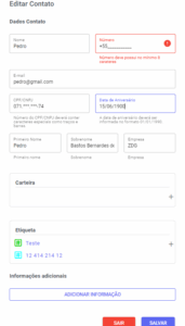 Ao preencher corretamente os campos de nome, número, CPF/CNPJ, carteira, etiquetas e dados adicionais, sua equipe ganha contexto e evita retrabalho — o que resulta em mais produtividade e uma melhor experiência para o cliente.